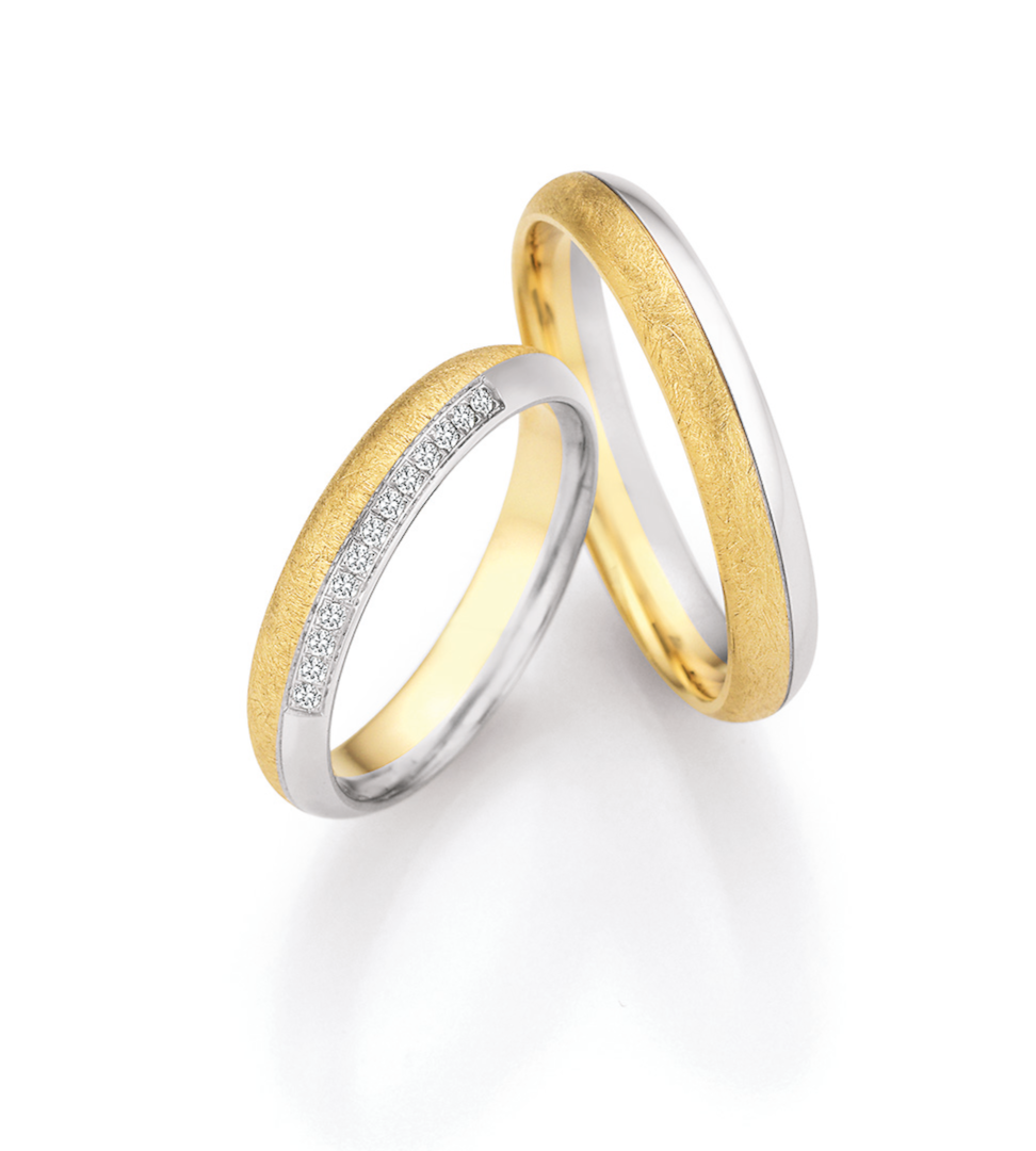 Diese 14kt. Weiß/Gelbgold Eheringe sind durch die Brillantsetzung, welche beim Damenring seitlich in der Bombierung gefasst sind, in einer außergewöhnlicher Form verarbeitet. Die 13 Brillanten sind im Weißgold-Teil mit einer Körnerfassung gefasst. Dieser feminine Damenring hebt die Weiblichkeit extra heraus. Das Farbenspiel wird beim Gelbgold durch die geeiste Oberfläche, in Kombination mit dem polierten Weißgold, besonders betont. Der geradlinige Herrenring passt perfekt zum Damenmodell.