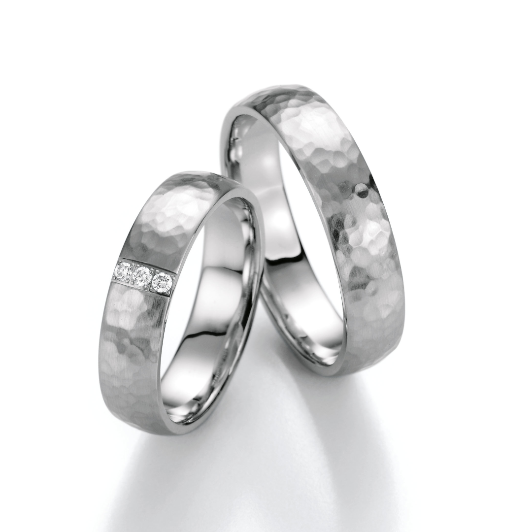 Dieses extravagante Ehering-Paar in 14kt. Weißgold überzeugt durch eine Goldschmiede Design. Die Hammerschlagoptik der Oberfläche wird von Hand gemacht und ist besonders robust und strapazierfähig. Die 3 hochwertigen Brillanten, geben dem Damenring den femininen Touch. Der edle Herrenring passt sich dem Design an.