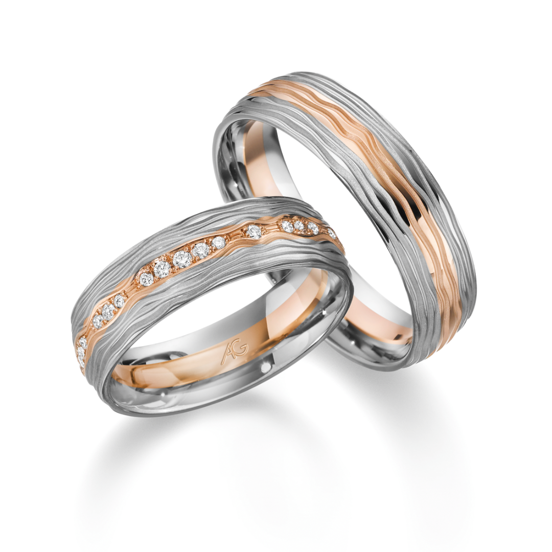 Dieses außergewöhnliche Modell geht in die Tiefe! Beide Ringe sind in 14kt Weißgold, mit einem Mittelteil in 14kt.Rotgold, gefertigt. Absolut einzigartig sind die Rillen der Oberfläche, welche wellenartig verlaufen und diesem Modell Höhen und Tiefen verleihen. Im Damenring funkeln 21 Brillanten, die diesen Ring zum wahren Eyecatcher am Finger machen. Der passende Herrenring ergänzt den Damenring ohne Steine.